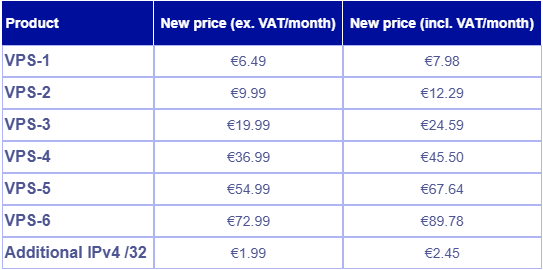 Линейка VPS — базовый VPS-1 подорожал до €6.49/мес, средний VPS-3 теперь стоит €19.99/мес, а мощный VPS-6 обойдется в €72.99/мес.